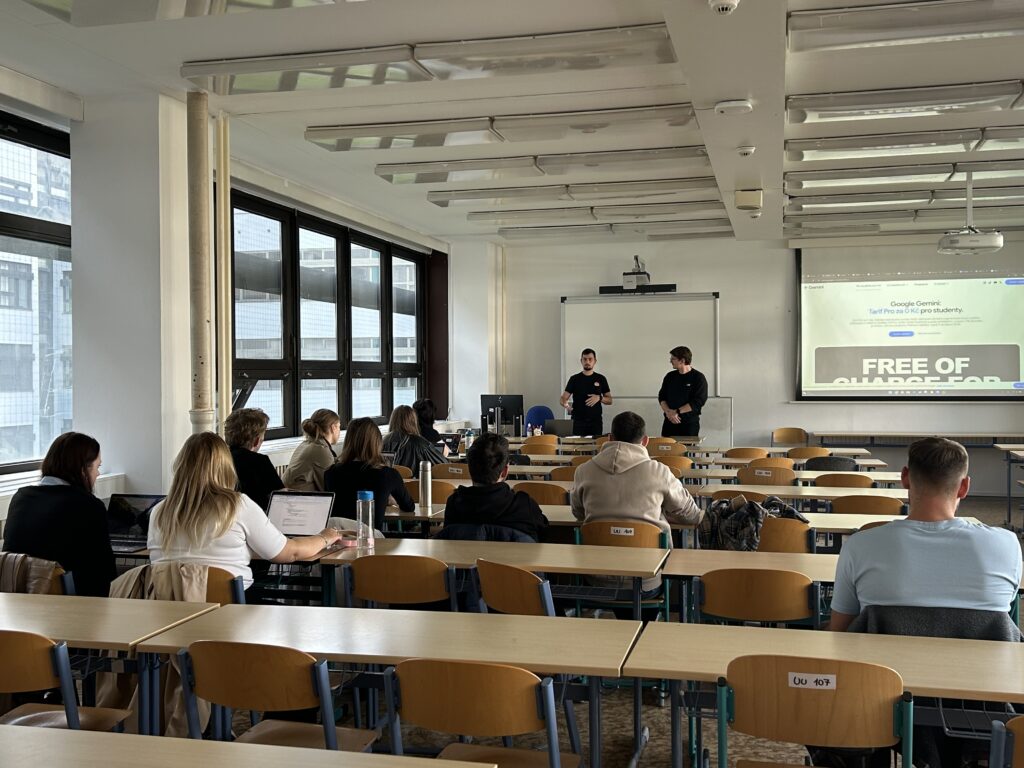 Workshop pro studující pojali velmi prakticky. Účastníci si vyzkoušeli práci s různými typy aplikací využívajících umělou inteligenci a získali konkrétní tipy, jak je lze smysluplně zapojit do výuky i studijní přípravy. Důraz byl kladen nejen na efektivitu, ale také na kritické myšlení a uvědomění si role AI jako nástroje, nikoli náhrady lidské práce.